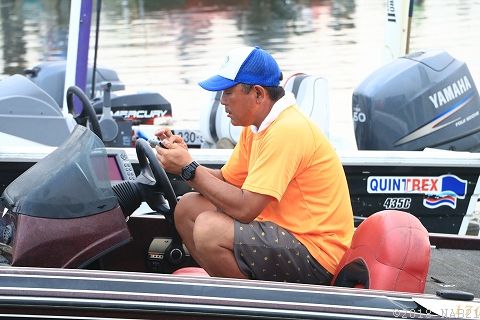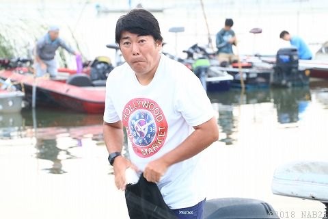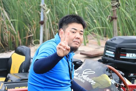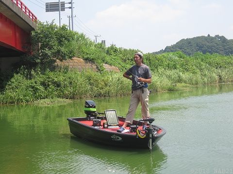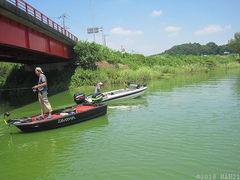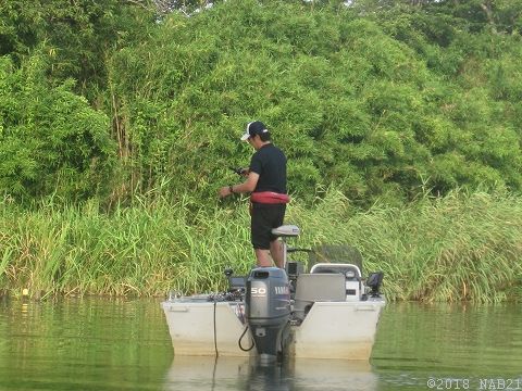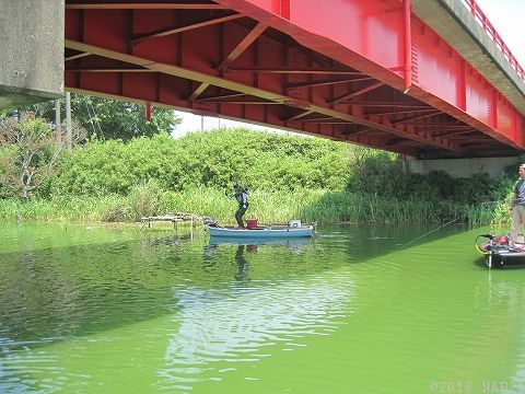気温35℃、水温33度。まさに温泉化したアオコグリーンの印旛沼。。