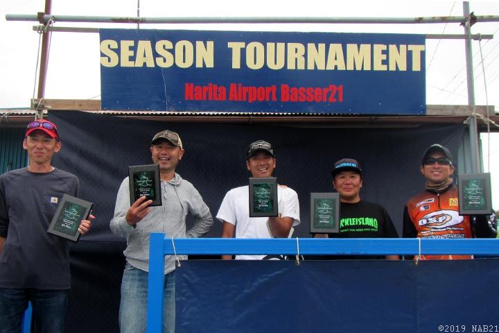 2位には新川中流域の護岸や橋脚を攻めた桜井選手がノーシンカーやテキサスリグで2,730gを持ち込み1位まで100g差まで詰め寄った。3位は3連続TOP5入賞の大渕選手が神崎川から、4位高木選手も神崎川攻めで、5位に船戸師戸や鹿島川を攻めた山添(大)選手が入った。